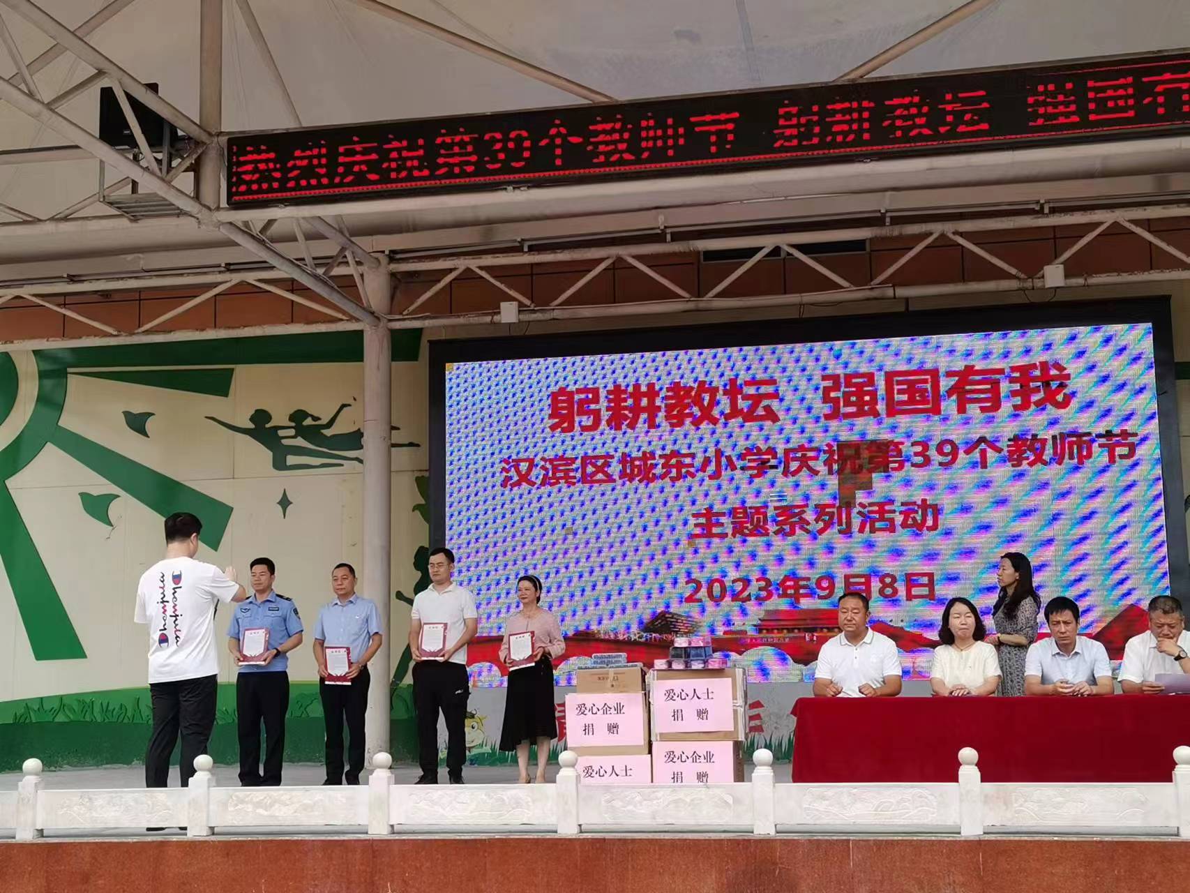 孙荷香总经理 在汉滨区城东小学,与全校师生一起庆祝第39个教师节 主题系列活动,并捐款。